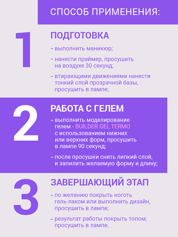 Откройте для себя термо гель для ногтей от Фокси Эксперт! Гель с термоэффектом, реагирует изменением оттенка цвета на изменение температуры вашего тела или окружающей среды, создавая эффект градиента и добавляя вашему образу особую изюминку. Самовыравнивающийся BUILDER GEL обладает средней вязкостью, что делает его легким в нанесении и распределении по ноготкам. Прекрасно поджимается в арку на 10-15 секунде. Трехфазный гель камуфляж незаметен при отрастании и эффективно скрывает дефекты ногтевой пластины, придавая ей здоровый и естественный вид. Эластичный в тонком слое и жесткий в выравнивающем (не менее 1,5 мм), идеально подходит для различных техник: • Техника "без опила" • Донаращивание по воздуху • Наращивание любой длины на верхние и нижние шаблоны • Поднятие "клювов" • Моделирование архитектуры ногтевой пластины • Создание креативных форм, включая когти • Выкладной френч • Укрепление и ремонт Наибольшая смена цвета наблюдается на свободном крае, так как температура там всегда ниже – кончик ногтя не соприкасается с кожей. Важно перед применением тщательно перемешать гель. Рекомендуется наносить на подложку и базы, а готовый маникюр перекрывать топом для защиты и блеска. Легко снимается спиливанием фрезой или пилкой. Гель для маникюра коллекции TERMO станет отличным подарком для женщин к любому празднику. Создайте идеальные ногти с товарами для маникюра от Foxy Expert!