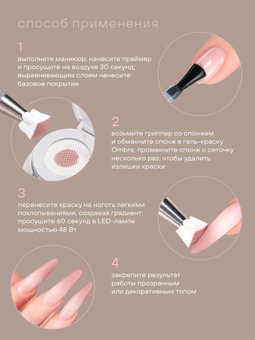 Профессиональная гель краска для градиента от Foxy Expert создана для выполнения плавных переходов цвета и эффектных дизайнов. Гель краска для ногтей имеет плотную пигментацию, легко растягивается и позволяет контролировать насыщенность оттенка. Гель краска комфортна в работе и подходит как для салонного, так и для домашнего маникюра. Гель краска для френча помогает создать четкую линию улыбки без растеканий и неровностей. Материал ложится ровным слоем и не требует многократного перекрытия. Универсальная гель краска для ногтей отлично подходит для классического, цветного и дизайнерского френча, а также для минималистичных акцентов. Удобная в нанесении гель краска для градиента позволяет выполнять омбре, baby boomer и мягкие растяжки цвета. Профессиональная гель краска не затекает под кутикулу, сохраняет цвет после полимеризации и обеспечивает аккуратный результат. Именно поэтому гель краска для градиента востребована среди мастеров ногтевого сервиса. Пигментированная гель краска для ногтей обеспечивает равномерное покрытие. Удобная упаковка для экономичного использования сеточка для равномерного дозирования - возможность взять необходимое количество продукта. Способ применения: 1. Нанести праймер, просушить на воздухе 30 секунд; - подготовить ногтевую пластину к покрытию гель-краской: восстановить правильную архитектуру ногтя, выполнить выравнивание; 2. Работа с гель-краской - возьмите спонж с помощью гриппера, обмакните спонж в гель-краску Ombre, удалите излишки, прижав к несколько раз к любой поверхности; - перенесите цвет на ноготь легкими припечатывающими движениями, создавая мягкие градиенты; - просушить в LED-лампе 60 секунд; - при необходимости повторить или выполнить дизайн; 3. закрепить результат работы любым прозрачным или декоративным топом.