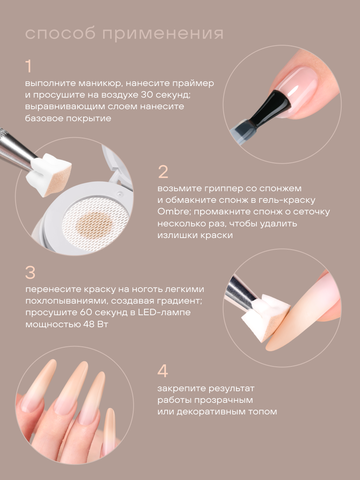 Профессиональная гель краска для градиента от Foxy Expert создана для выполнения плавных переходов цвета и эффектных дизайнов. Гель краска для ногтей имеет плотную пигментацию, легко растягивается и позволяет контролировать насыщенность оттенка. Гель краска комфортна в работе и подходит как для салонного, так и для домашнего маникюра. Гель краска для френча помогает создать четкую линию улыбки без растеканий и неровностей. Материал ложится ровным слоем и не требует многократного перекрытия. Универсальная гель краска для ногтей отлично подходит для классического, цветного и дизайнерского френча, а также для минималистичных акцентов. Удобная в нанесении гель краска для градиента позволяет выполнять омбре, baby boomer и мягкие растяжки цвета. Профессиональная гель краска не затекает под кутикулу, сохраняет цвет после полимеризации и обеспечивает аккуратный результат. Именно поэтому гель краска для градиента востребована среди мастеров ногтевого сервиса. Пигментированная гель краска для ногтей обеспечивает равномерное покрытие. Удобная упаковка для экономичного использования сеточка для равномерного дозирования - возможность взять необходимое количество продукта. Способ применения: 1. Нанести праймер, просушить на воздухе 30 секунд; - подготовить ногтевую пластину к покрытию гель-краской: восстановить правильную архитектуру ногтя, выполнить выравнивание; 2. Работа с гель-краской - возьмите спонж с помощью гриппера, обмакните спонж в гель-краску Ombre, удалите излишки, прижав к несколько раз к любой поверхности; - перенесите цвет на ноготь легкими припечатывающими движениями, создавая мягкие градиенты; - просушить в LED-лампе 60 секунд; - при необходимости повторить или выполнить дизайн; 3. закрепить результат работы любым прозрачным или декоративным топом.