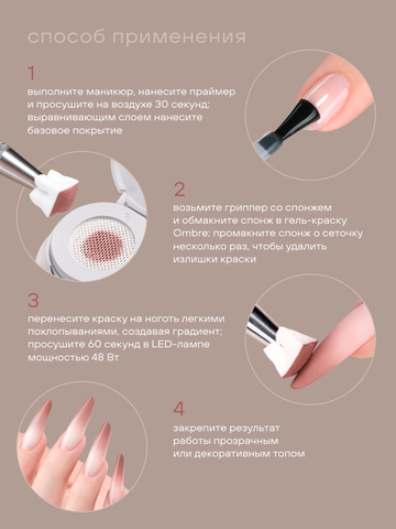 Профессиональная гель краска для градиента от Foxy Expert создана для выполнения плавных переходов цвета и эффектных дизайнов. Гель краска для ногтей имеет плотную пигментацию, легко растягивается и позволяет контролировать насыщенность оттенка. Гель краска комфортна в работе и подходит как для салонного, так и для домашнего маникюра. Гель краска для френча помогает создать четкую линию улыбки без растеканий и неровностей. Материал ложится ровным слоем и не требует многократного перекрытия. Универсальная гель краска для ногтей отлично подходит для классического, цветного и дизайнерского френча, а также для минималистичных акцентов. Удобная в нанесении гель краска для градиента позволяет выполнять омбре, baby boomer и мягкие растяжки цвета. Профессиональная гель краска не затекает под кутикулу, сохраняет цвет после полимеризации и обеспечивает аккуратный результат. Именно поэтому гель краска для градиента востребована среди мастеров ногтевого сервиса. Пигментированная гель краска для ногтей обеспечивает равномерное покрытие. Удобная упаковка для экономичного использования сеточка для равномерного дозирования - возможность взять необходимое количество продукта. Способ применения: 1. Нанести праймер, просушить на воздухе 30 секунд; - подготовить ногтевую пластину к покрытию гель-краской: восстановить правильную архитектуру ногтя, выполнить выравнивание; 2. Работа с гель-краской - возьмите спонж с помощью гриппера, обмакните спонж в гель-краску Ombre, удалите излишки, прижав к несколько раз к любой поверхности; - перенесите цвет на ноготь легкими припечатывающими движениями, создавая мягкие градиенты; - просушить в LED-лампе 60 секунд; - при необходимости повторить или выполнить дизайн; 3. закрепить результат работы любым прозрачным или декоративным топом.