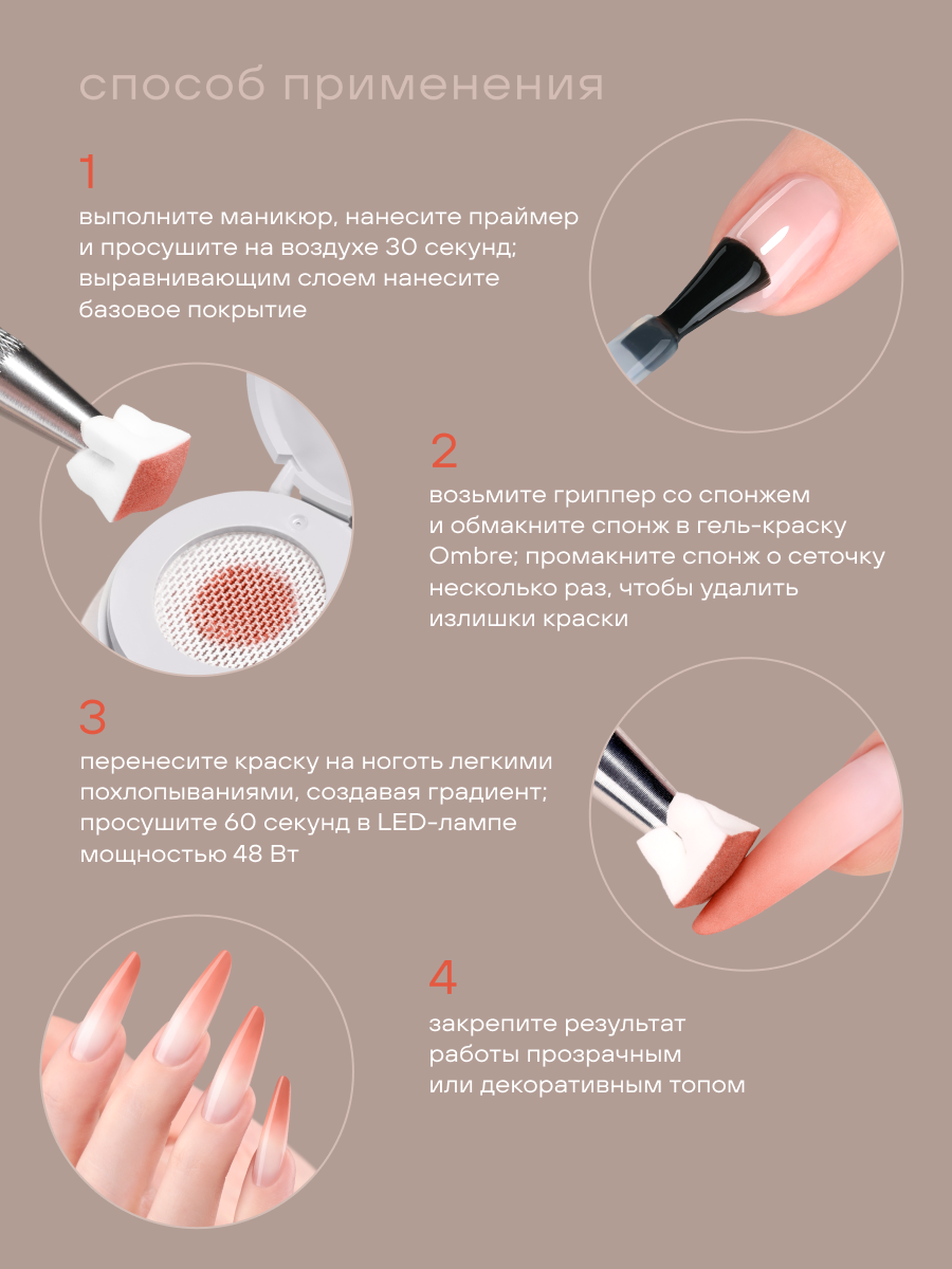 Профессиональная гель краска для градиента от Foxy Expert создана для выполнения плавных переходов цвета и эффектных дизайнов. Гель краска для ногтей имеет плотную пигментацию, легко растягивается и позволяет контролировать насыщенность оттенка. Гель краска комфортна в работе и подходит как для салонного, так и для домашнего маникюра. Гель краска для френча помогает создать четкую линию улыбки без растеканий и неровностей. Материал ложится ровным слоем и не требует многократного перекрытия. Универсальная гель краска для ногтей отлично подходит для классического, цветного и дизайнерского френча, а также для минималистичных акцентов. Удобная в нанесении гель краска для градиента позволяет выполнять омбре, baby boomer и мягкие растяжки цвета. Профессиональная гель краска не затекает под кутикулу, сохраняет цвет после полимеризации и обеспечивает аккуратный результат. Именно поэтому гель краска для градиента востребована среди мастеров ногтевого сервиса. Пигментированная гель краска для ногтей обеспечивает равномерное покрытие. Удобная упаковка для экономичного использования сеточка для равномерного дозирования - возможность взять необходимое количество продукта. Способ применения: 1. Нанести праймер, просушить на воздухе 30 секунд; - подготовить ногтевую пластину к покрытию гель-краской: восстановить правильную архитектуру ногтя, выполнить выравнивание; 2. Работа с гель-краской - возьмите спонж с помощью гриппера, обмакните спонж в гель-краску Ombre, удалите излишки, прижав к несколько раз к любой поверхности; - перенесите цвет на ноготь легкими припечатывающими движениями, создавая мягкие градиенты; - просушить в LED-лампе 60 секунд; - при необходимости повторить или выполнить дизайн; 3. закрепить результат работы любым прозрачным или декоративным топом.