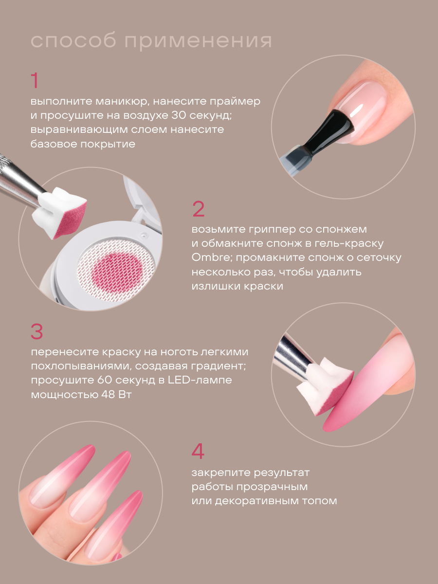 Профессиональная гель краска для градиента от Foxy Expert создана для выполнения плавных переходов цвета и эффектных дизайнов. Гель краска для ногтей имеет плотную пигментацию, легко растягивается и позволяет контролировать насыщенность оттенка. Гель краска комфортна в работе и подходит как для салонного, так и для домашнего маникюра. Гель краска для френча помогает создать четкую линию улыбки без растеканий и неровностей. Материал ложится ровным слоем и не требует многократного перекрытия. Универсальная гель краска для ногтей отлично подходит для классического, цветного и дизайнерского френча, а также для минималистичных акцентов. Удобная в нанесении гель краска для градиента позволяет выполнять омбре, baby boomer и мягкие растяжки цвета. Профессиональная гель краска не затекает под кутикулу, сохраняет цвет после полимеризации и обеспечивает аккуратный результат. Именно поэтому гель краска для градиента востребована среди мастеров ногтевого сервиса. Пигментированная гель краска для ногтей обеспечивает равномерное покрытие. Удобная упаковка для экономичного использования сеточка для равномерного дозирования - возможность взять необходимое количество продукта. Способ применения: 1. Нанести праймер, просушить на воздухе 30 секунд; - подготовить ногтевую пластину к покрытию гель-краской: восстановить правильную архитектуру ногтя, выполнить выравнивание; 2. Работа с гель-краской - возьмите спонж с помощью гриппера, обмакните спонж в гель-краску Ombre, удалите излишки, прижав к несколько раз к любой поверхности; - перенесите цвет на ноготь легкими припечатывающими движениями, создавая мягкие градиенты; - просушить в LED-лампе 60 секунд; - при необходимости повторить или выполнить дизайн; 3. закрепить результат работы любым прозрачным или декоративным топом.