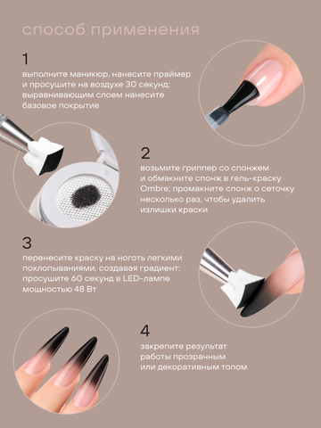 Профессиональная гель краска для градиента от Foxy Expert создана для выполнения плавных переходов цвета и эффектных дизайнов. Гель краска для ногтей имеет плотную пигментацию, легко растягивается и позволяет контролировать насыщенность оттенка. Гель краска комфортна в работе и подходит как для салонного, так и для домашнего маникюра. Гель краска для френча помогает создать четкую линию улыбки без растеканий и неровностей. Материал ложится ровным слоем и не требует многократного перекрытия. Универсальная гель краска для ногтей отлично подходит для классического, цветного и дизайнерского френча, а также для минималистичных акцентов. Удобная в нанесении гель краска для градиента позволяет выполнять омбре, baby boomer и мягкие растяжки цвета. Профессиональная гель краска не затекает под кутикулу, сохраняет цвет после полимеризации и обеспечивает аккуратный результат. Именно поэтому гель краска для градиента востребована среди мастеров ногтевого сервиса. Пигментированная гель краска для ногтей обеспечивает равномерное покрытие. Удобная упаковка для экономичного использования сеточка для равномерного дозирования - возможность взять необходимое количество продукта. Способ применения: 1. Нанести праймер, просушить на воздухе 30 секунд; - подготовить ногтевую пластину к покрытию гель-краской: восстановить правильную архитектуру ногтя, выполнить выравнивание; 2. Работа с гель-краской - возьмите спонж с помощью гриппера, обмакните спонж в гель-краску Ombre, удалите излишки, прижав к несколько раз к любой поверхности; - перенесите цвет на ноготь легкими припечатывающими движениями, создавая мягкие градиенты; - просушить в LED-лампе 60 секунд; - при необходимости повторить или выполнить дизайн; 3. закрепить результат работы любым прозрачным или декоративным топом.