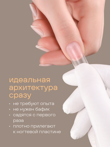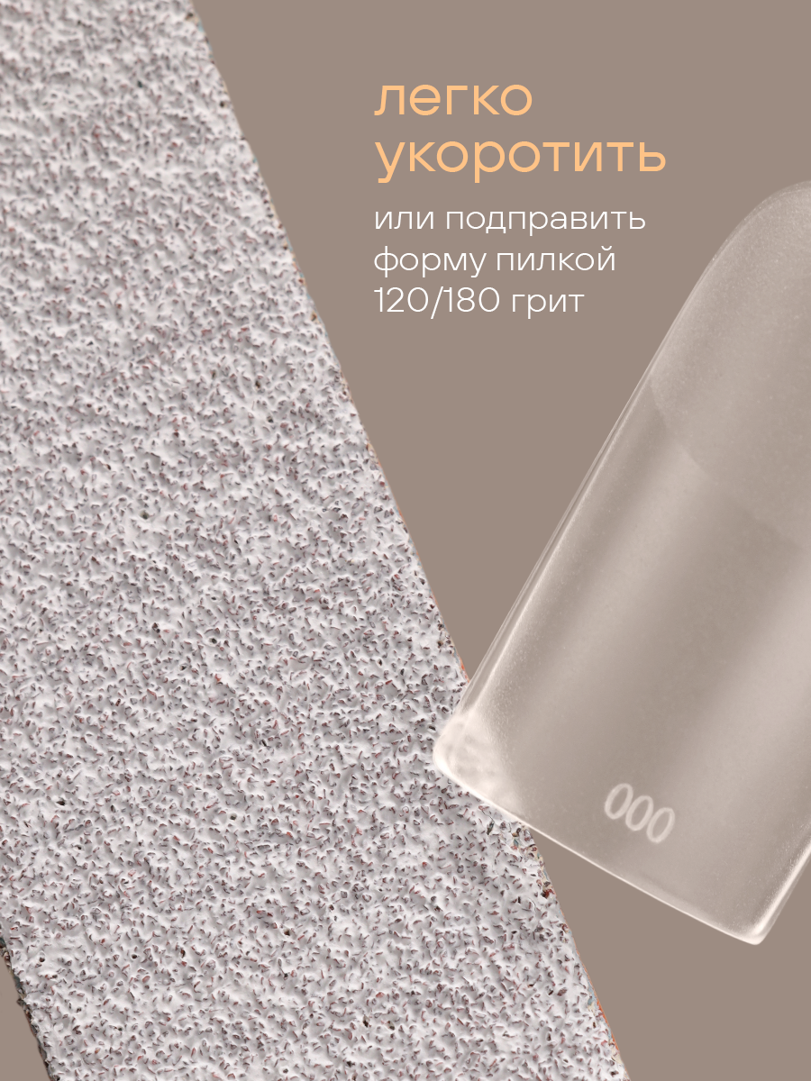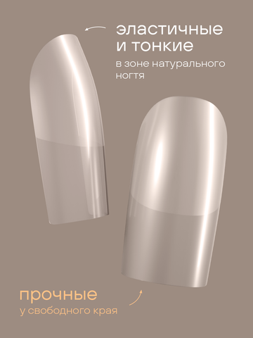 Внутренняя матовая поверхность ногтевого ложа обеспечивает надежную сцепку с натуральным ногтем, а глянцевая внутренняя сторона свободного края гарантирует безупречную чистоту и эстетичный вид изнанки ногтя.