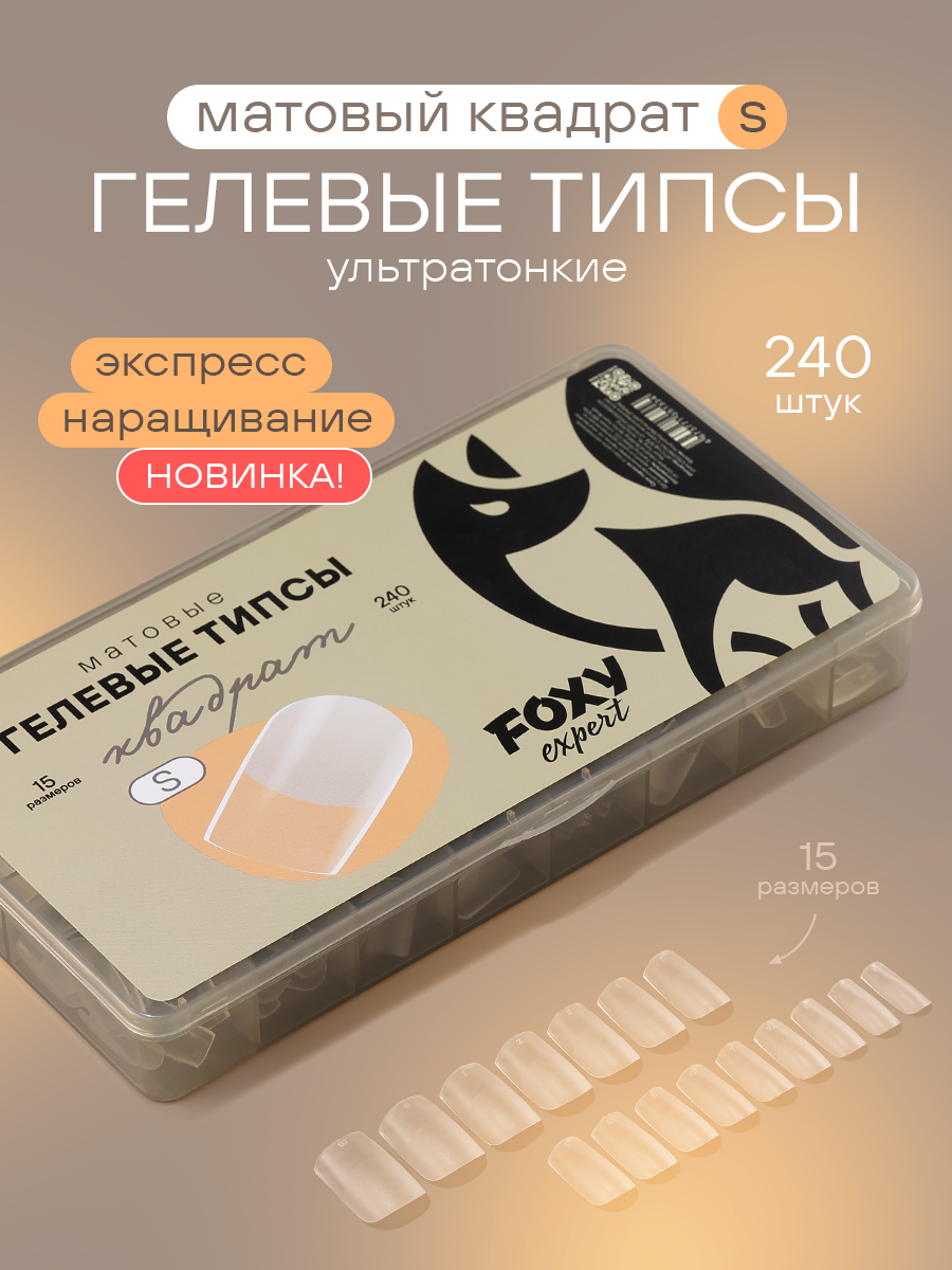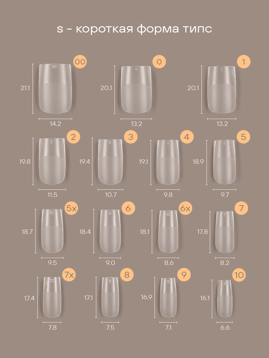 Набор матовых гелевых типс Квадрат короткие (размер S) включает в себя 15 размеров 240 штук. Широкий размерный ряд позволяет подобрать типсы для любых ногтей, обеспечивая плотное прилегание к ногтевой пластине.