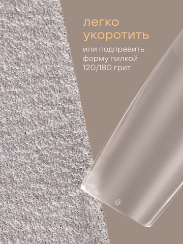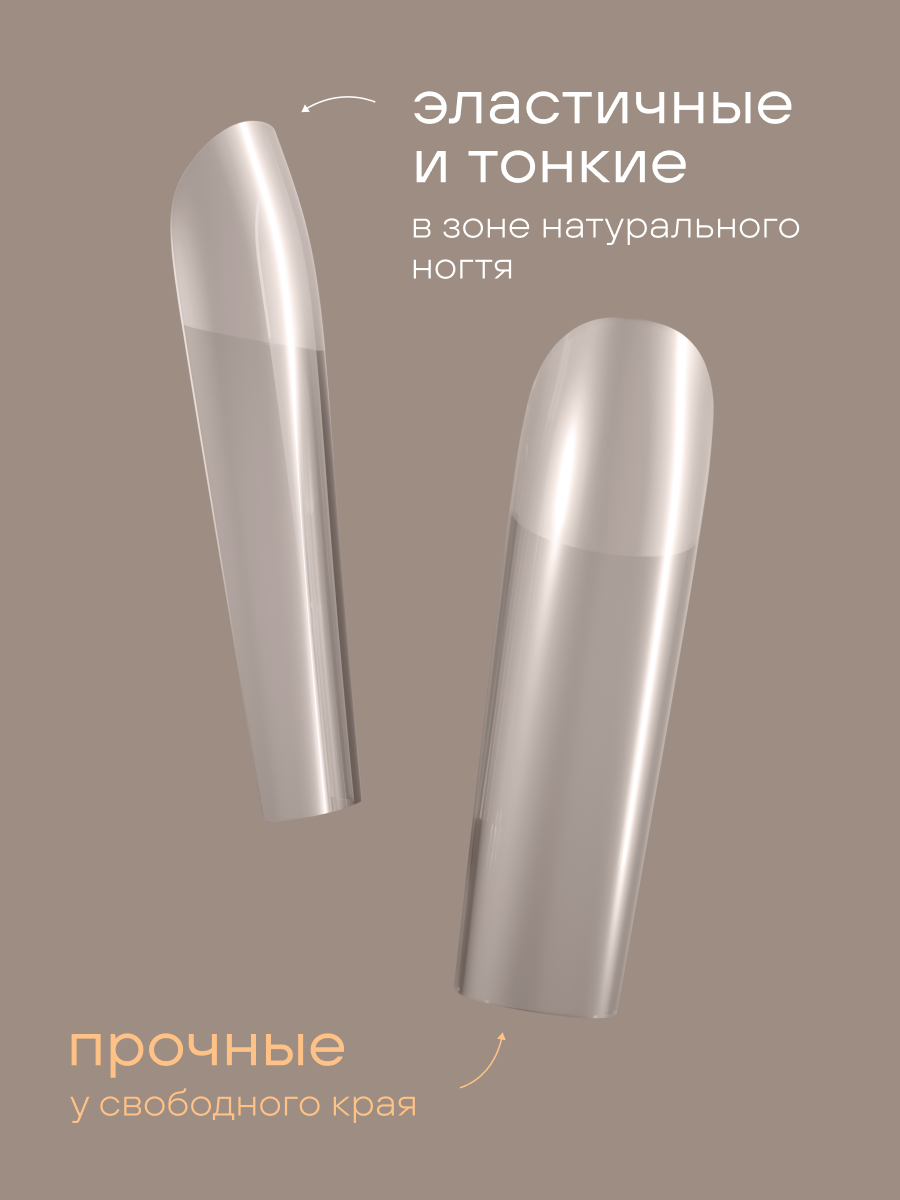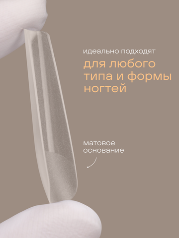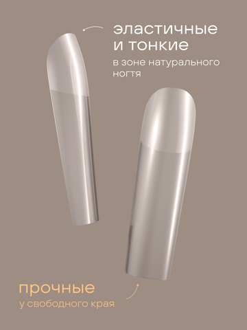 Внутренняя матовая поверхность ногтевого ложа обеспечивает надежную сцепку с натуральным ногтем, а глянцевая внутренняя сторона свободного края гарантирует безупречную чистоту и эстетичный вид изнанки ногтя.