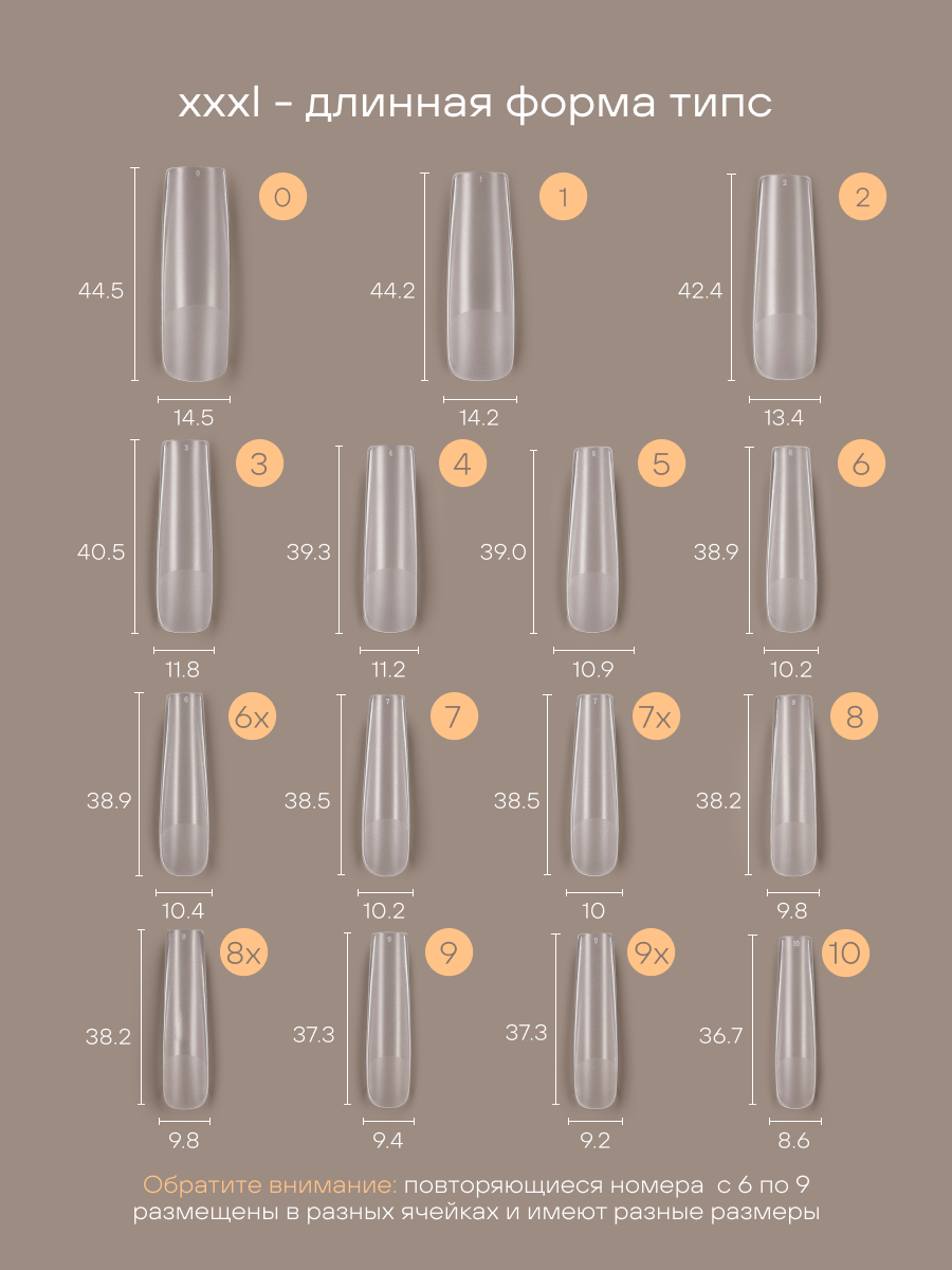 Набор матовых гелевых типс Квадрат длинные (размер XXXL) включает в себя 15 размеров 240 штук. Широкий размерный ряд позволяет подобрать типсы для любых ногтей, обеспечивая плотное прилегание к ногтевой пластине.