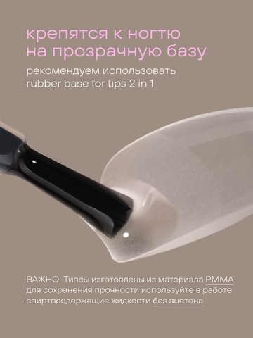 ВАЖНО! Типсы изготовлены из материала PMMA (растворим в ацетоне). В работе с ними используйте только спиртосодержащие жидкости и средства БЕЗ ацетона в составе, чтобы не повредить структуру материала.