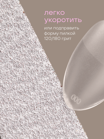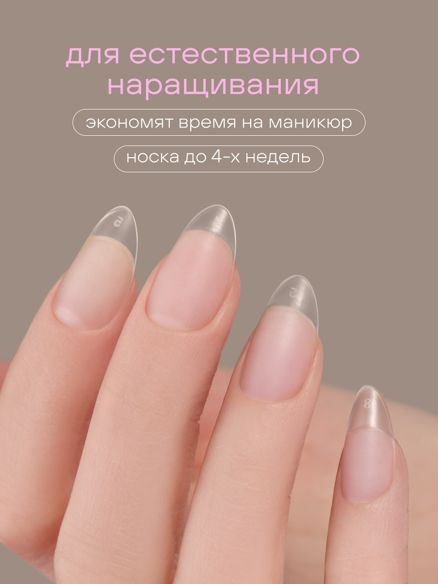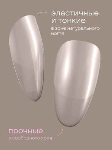Внутренняя матовая поверхность ногтевого ложа обеспечивает надежную сцепку с натуральным ногтем, а глянцевая внутренняя сторона свободного края гарантирует безупречную чистоту и эстетичный вид изнанки ногтя.