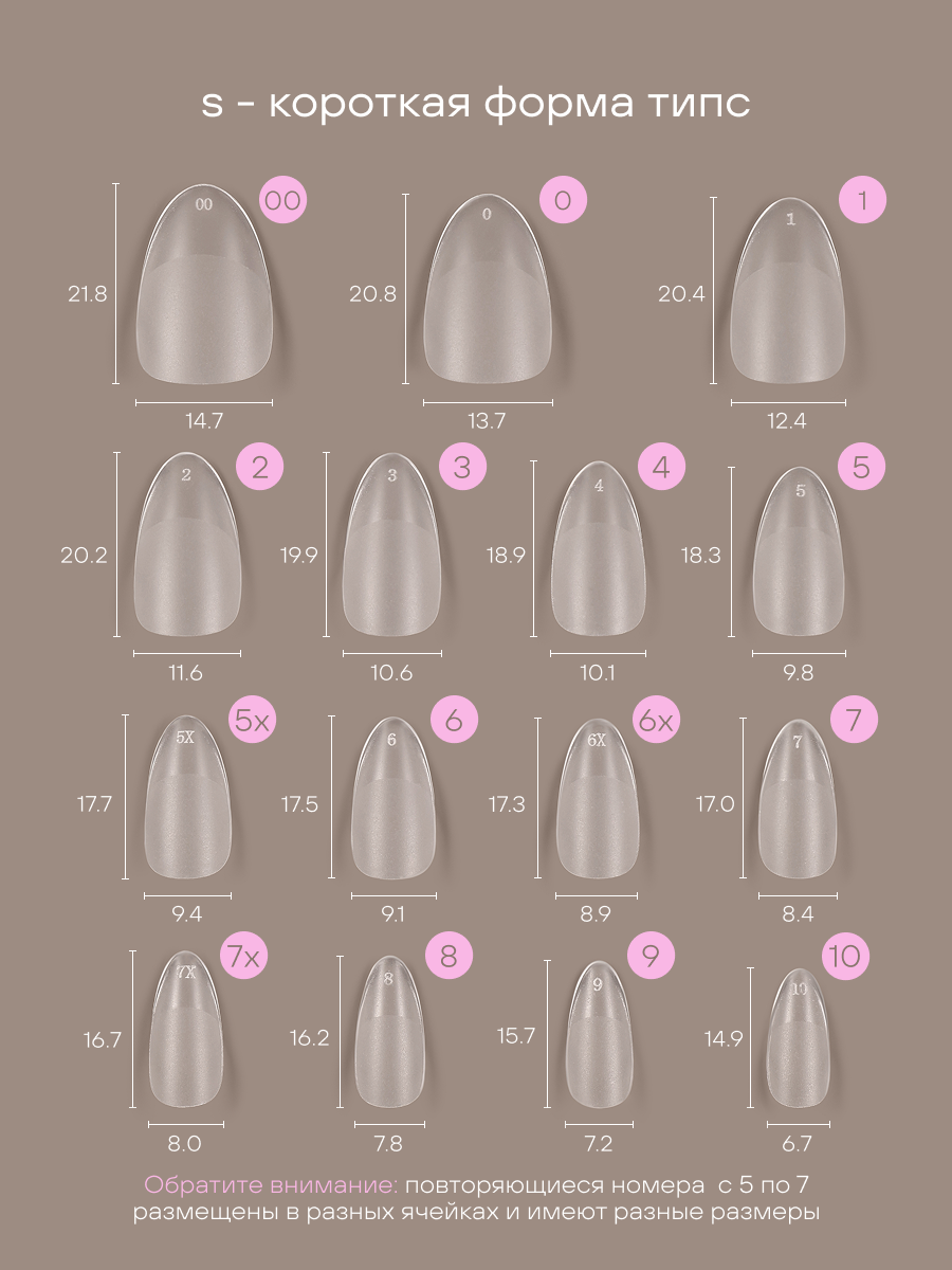 Набор матовых гелевых типс Миндаль короткие (размер S) включает в себя 15 размеров 240 штук. Широкий размерный ряд позволяет подобрать типсы для любых ногтей, обеспечивая плотное прилегание к ногтевой пластине.