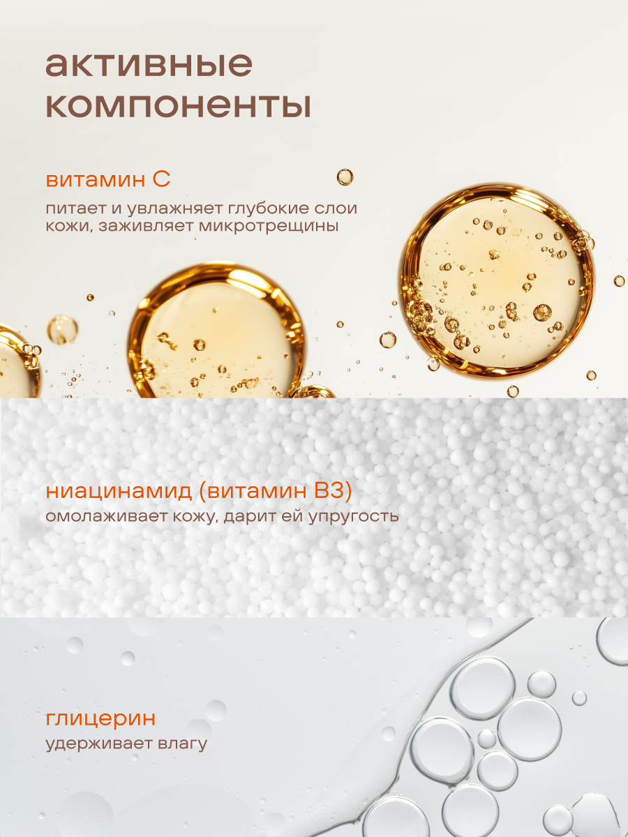 Подарите вашей коже мощный заряд энергии и сияния с нашим кремом 3 в 1 от FOXY EXPERT. Уникальная формула с витамином С и ниацинамидом (витамин В3) обеспечивает глубокий уход за кожей, работая как эффективный осветляющий крем против пигментации и тусклости. Этот увлажняющий крем объемом 75 мл — идеальный тревел формат, который удобно брать с собой в сумочку. Благодаря активным компонентам, он работает как восстанавливающий бальзам от трещин и сухости, обеспечивая профессиональный уход за руками, стопами и ногтями. Витамин В3 укрепляет защитный барьер, а витамин С стимулирует синтез коллагена, оказывая заметный антивозрастной эффект. Используйте его как питательный крем для борьбы от натоптышей или как ежедневное средство для смягчения кутикулы. Легкая текстура мгновенно впитывается, оставляя ощущение комфорта без липкости. Стильная упаковка и доказанная эффективность делают его отличной идеей подарка маме, подруге или коллеге. Позаботьтесь о красоте ваших рук и ног с помощью силы витаминов!