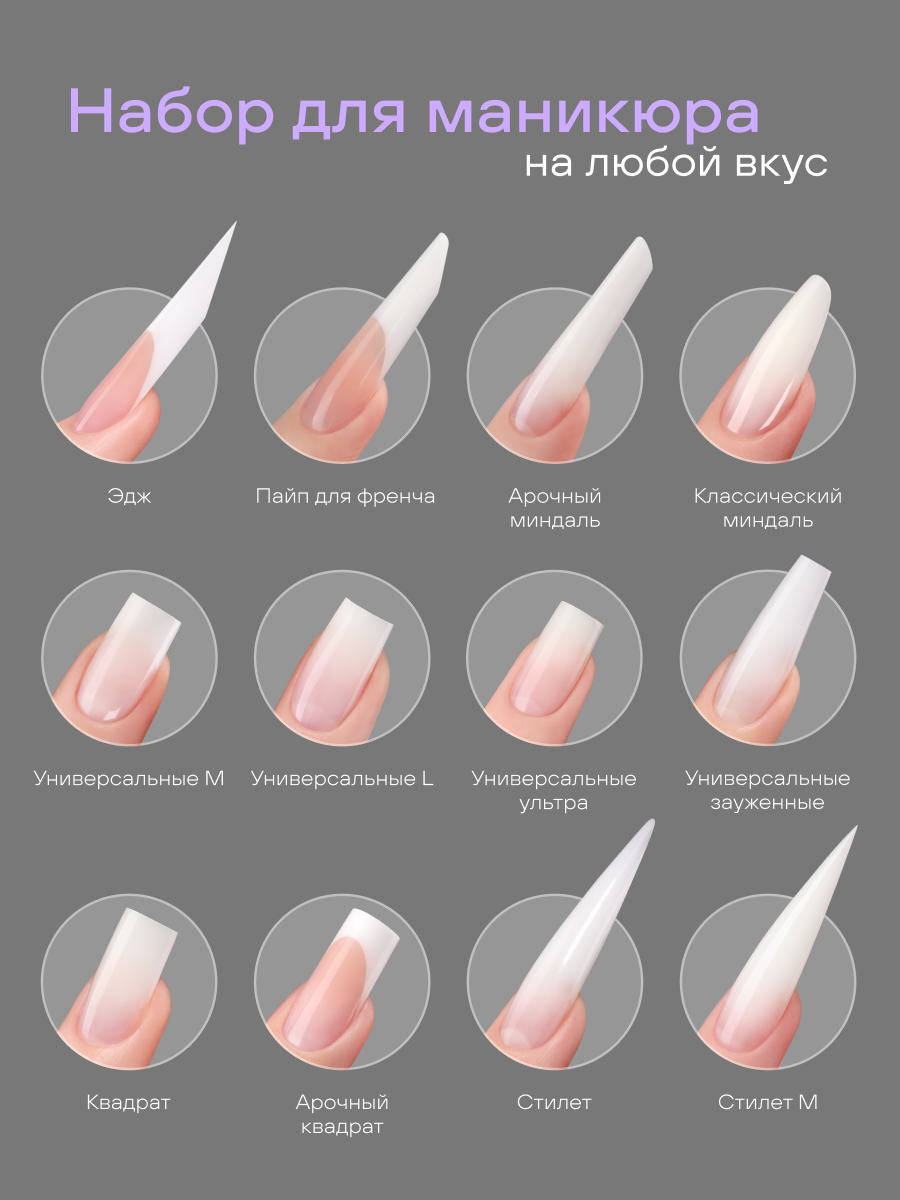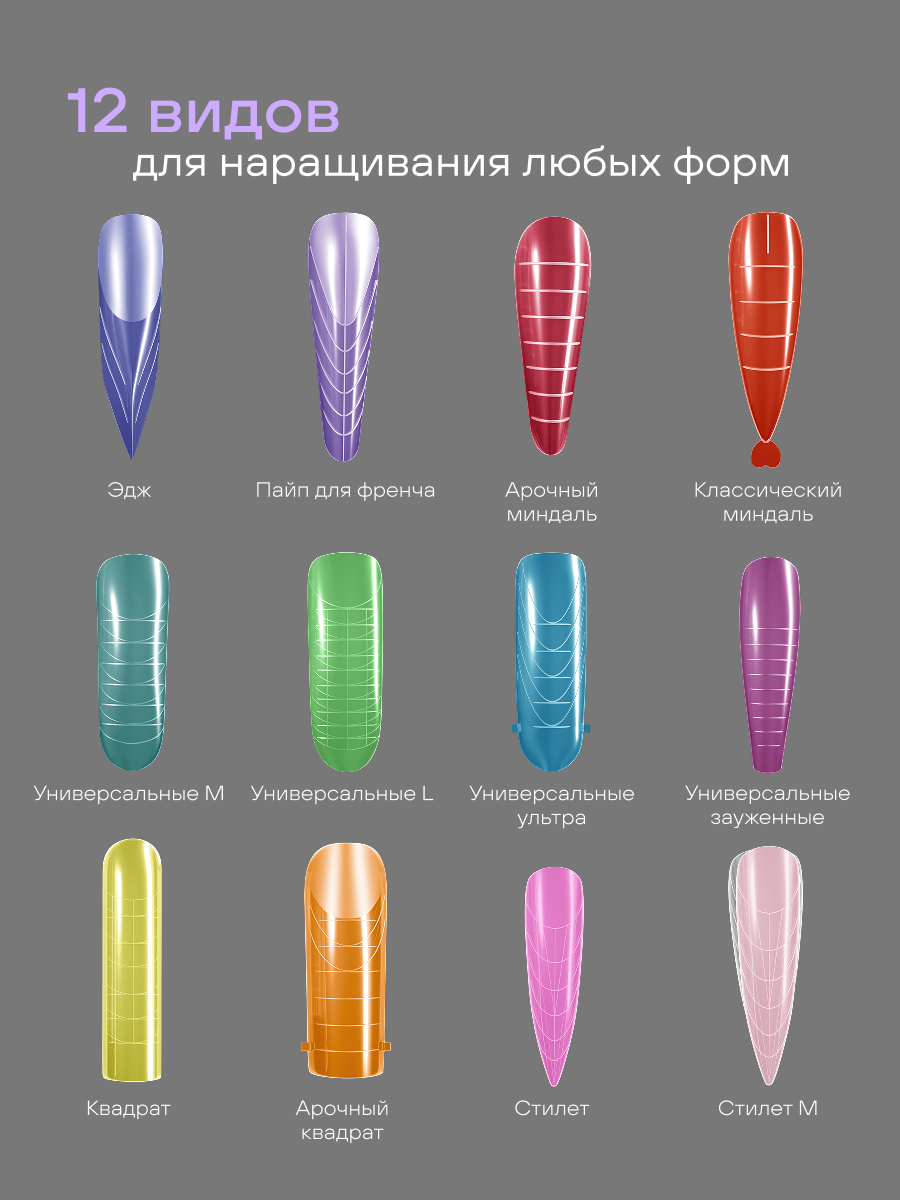 (Эдж, Пайп для френча, Арочный миндаль, Универсальные ультра, Универсальные М, Универсальные L, Стилет, Стилет M, Классический миндаль, Квадрат, Арочный квадрат, Универсальные зауженные)
