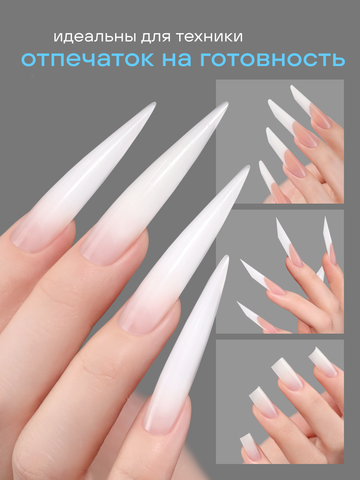 Мягкий пластик у кутикулы и твердый у конца позволяют работать в технике отпечатка на готовность, ногти почти не требуют опила после наращивания только по боковым параллелям.