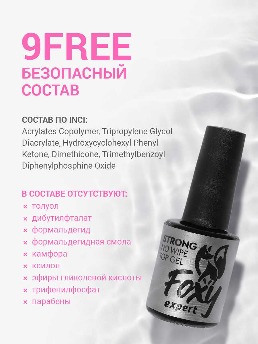 Глянцевый твердый топ для гель-лака для укрепления ногтей Фокси Эксперт. Идеальное средство алмазный закрепитель для гель лака без липкого слоя имеет среднюю консистенцию, за счет чего верхнее покрытие не утолщает ногтевую пластину и экономично расходуется, самовыравнивается, не желтеет на белых оттенках, не синит на черных, не царапается, не затирается, идельно покрывает гель-лаки. Финиш создает глянцевые блики, эффект мокрых ногтей. Зеркальный, стойкий блеск на протяжении всей носки маникюра. Блеск сохраняется до 6 недель. Топ без липкого слоя защищает маникюрное покрытие от царапин и сколов. Средняя по плотности консистенция гелевого закрепителя - универсальный вариант, который не растекается и легко проходит сушку в УФ лампе. Служит для закрепления дизайна и декора. Супер твердый финиш с эффектом глянца можно использовать дома и в салоне. Время полимеризации в УФ-лампе – 2 мин, в LED-лампе – 1мин. Покупайте завершающее верхнее покрытие в паре с базовым гелем для маникюра. Профессиональное средство можно использовать для маникюра и педикюра.